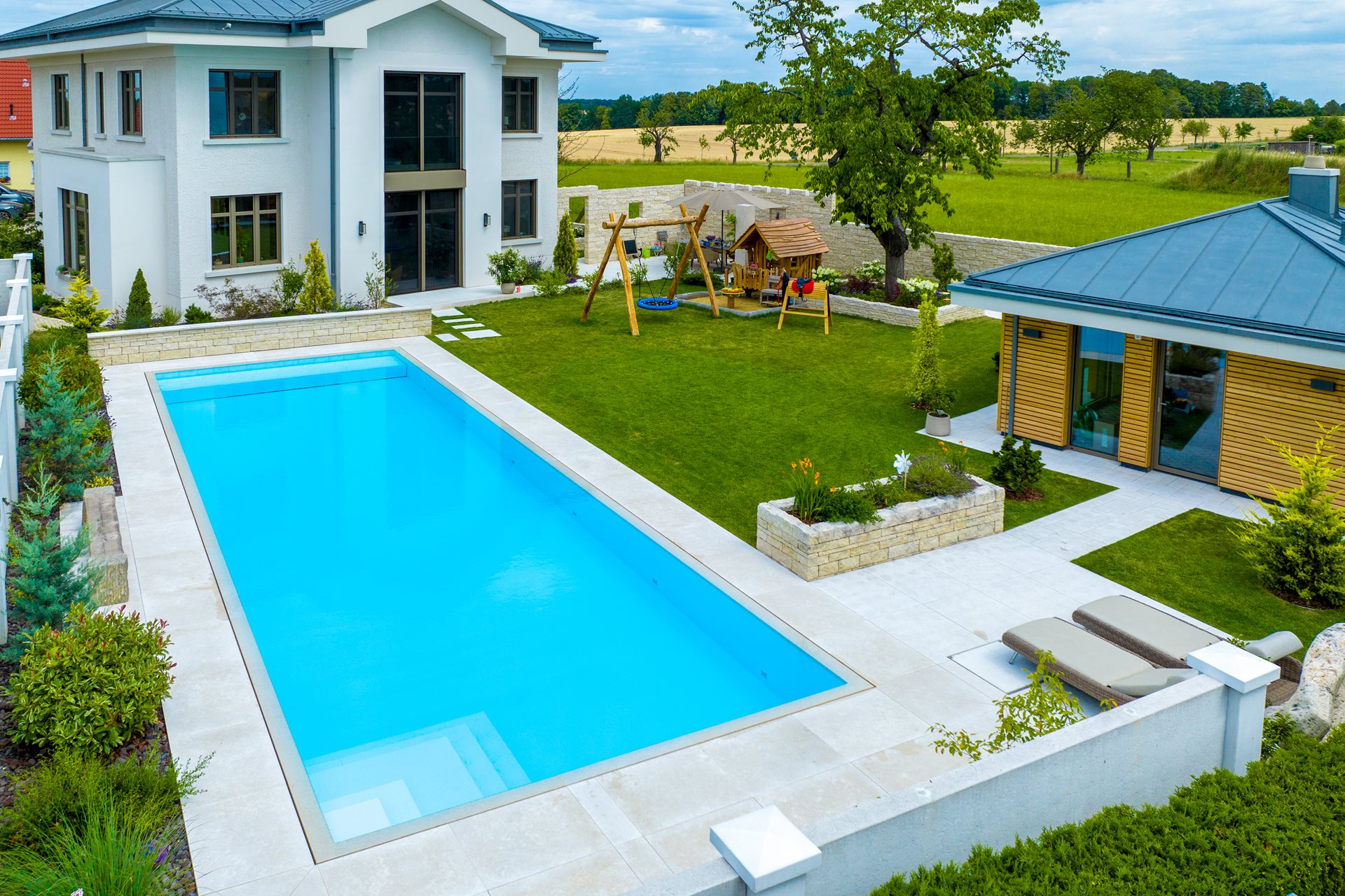 L’état fédéré de Saxe est certainement l’une des régions les plus pittoresques d’Allemagne. Il est connu pour son histoire, mais aussi pour ses incroyables paysages. La famille Seidel a choisi de confier la construction de sa piscine à l’entreprise DasSchwimmbad, un partenaire professionnel de NIVEKO, qu’elle a d’ailleurs qualifié de très professionnel et sympathique. La piscine à débordement NIVEKO Advance de couleur blanche et d’une dimension de 15 x 5 x 1,5 mètres se caractérise par des éléments en inox intégrés dans le corps de la piscine, typiques de la gamme de luxe NIVEKO Plus La gamme NIVEKO Plus propose non seulement des piscines fonctionnelles de haute qualité, mais également des produits design, de conception unique, dont chaque élément est réfléchi dans le moindre détail pour en faire des structures uniques et d’architecture remarquable dans chaque jardin.
